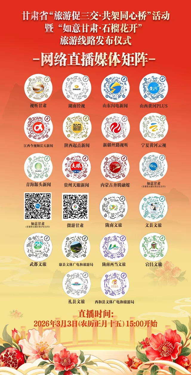 届时,活动将通过省内外主流新媒体平台同步直播,诚邀社会各界共襄盛举,以旅游为纽带,共架同心桥,共筑中华民族共有精神家园。(文/甘肃省文化和旅游厅 赵明)
