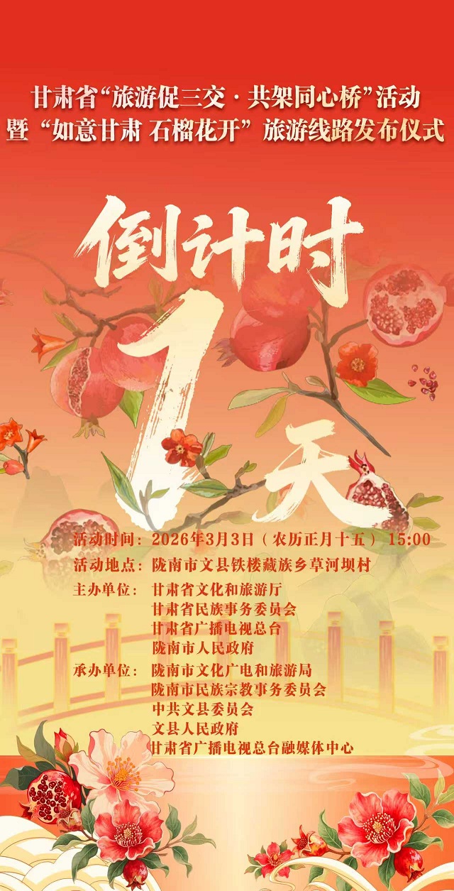 3月3日(农历正月十五),由甘肃省文化和旅游厅、甘肃省民族事务委员会、甘肃省广播电视总台、陇南市人民政府共同主办的甘肃省“旅游促三交·共架同心桥”活动暨“如意甘肃·石榴花开”旅游线路发布仪式,将在陇南市文县铁楼藏族乡草河坝村正式启幕。