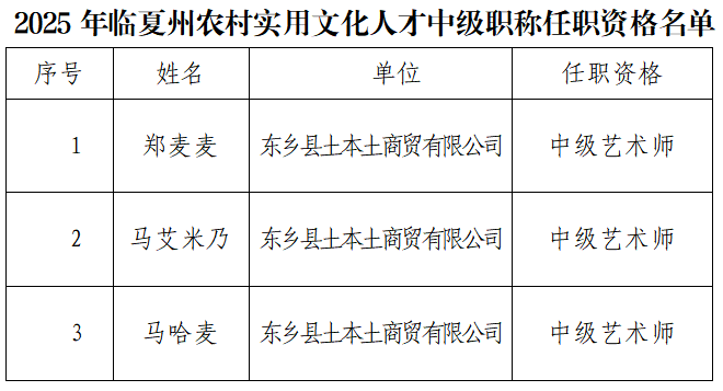 经临夏州农村实用文化人才中级职称评审委员会2025年12月4日会议评审通过,郑麦麦等三名同志具备农村实用文化人才中级艺术师任职资格。现将名单附后,请予以公布并通知本人。