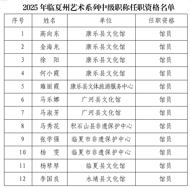 附件:2025年临夏州艺术系列中级职称任职资格名单