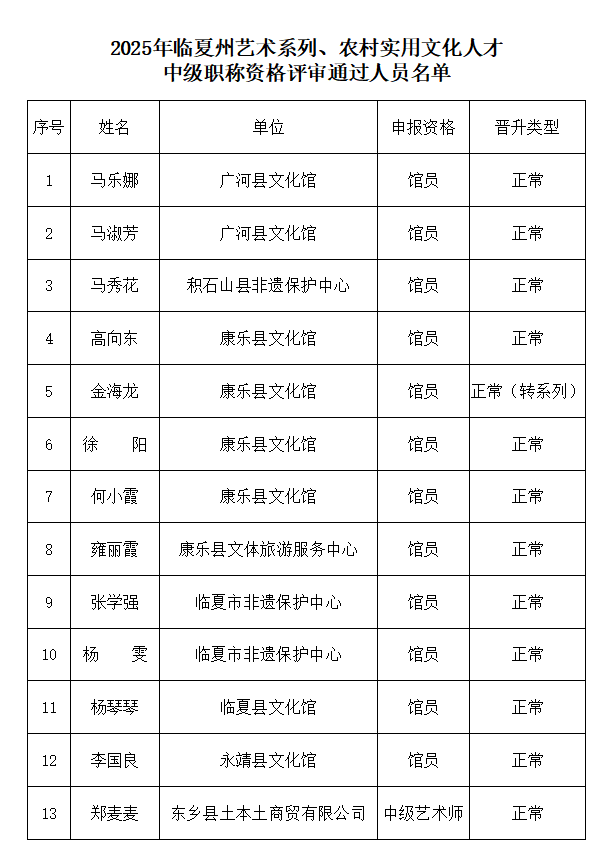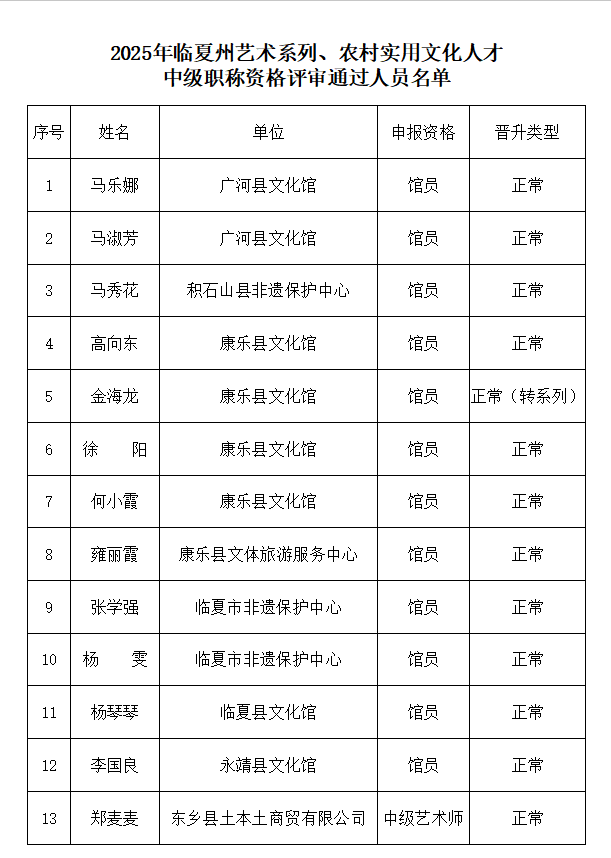 2025年临夏州艺术系列、农村实用文化人才中级职称资格评审结果公示