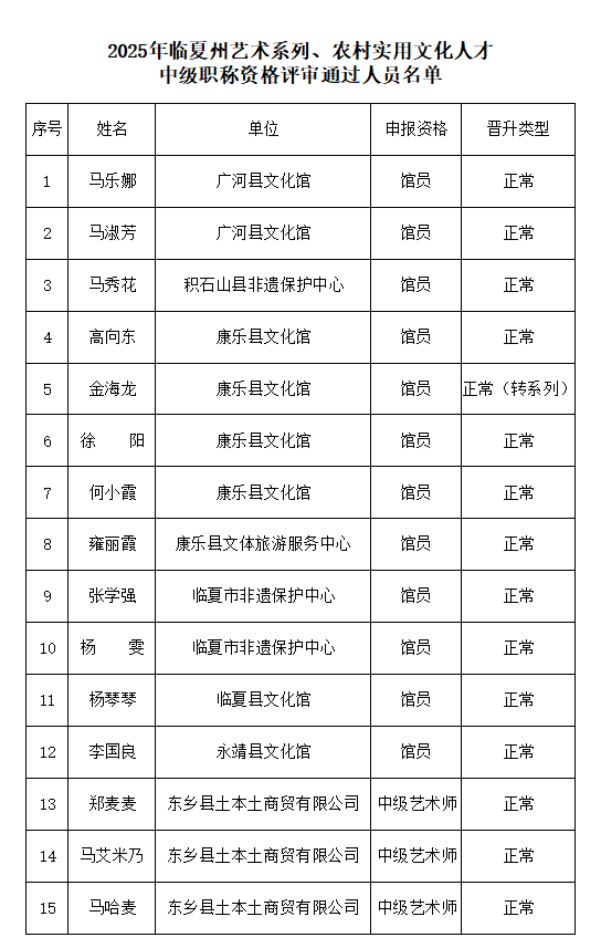 经临夏州艺术系列、农村实用文化人才中级职称评审委员会于2025年12月4日评审通过,高向东等15名同志具备相关系列中级职称资格,现予以公示,接受广大干部群众监督。公示期为2025年12月5日至12月11日,共5个工作日。