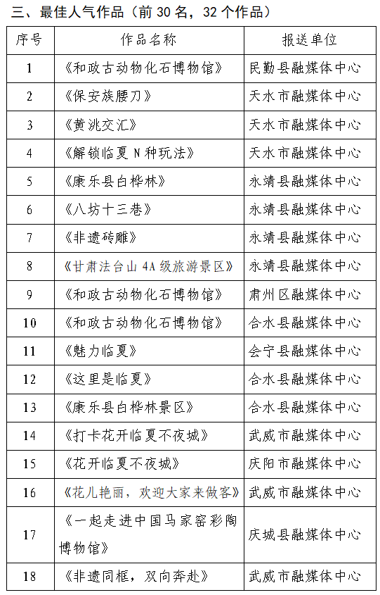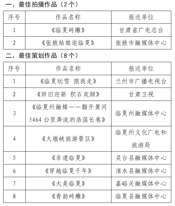 根据《甘肃省广播电视局关于开展“百家媒体进临夏广电视听展风采”冬季文旅宣传创作活动的通知》精神,经各单位自主申报、公开投票、集中评选,现对“百家媒体进临夏 广电视听展风采”冬季文旅宣传创作活动短视频优秀作品名单进行公示。