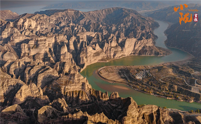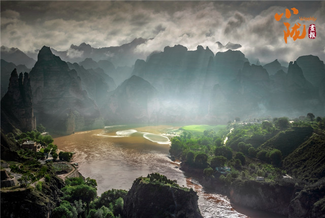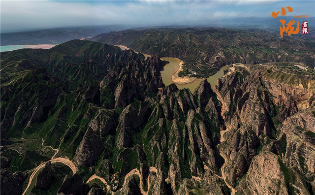 碧绿翠玉般的清清黄河水,蜿蜒流淌于险峻起伏的黄褐色沉积岩山地中。两岸的山峰像是被刀削斧劈过,峰顶形态各异、鳞次栉比、明暗交错、千姿百态。谷底,草木青翠、浪涛汹涌,舟船往来,汽笛声此起彼伏,回荡在耳边。水面与山峰形成90度的直角,构成黄河上游罕见的山水奇观。