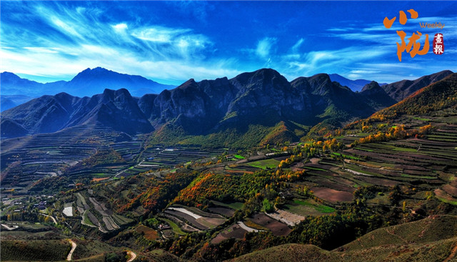 巍峨群山,连绵横亘。古朴的村庄,山上的树木,丰收的田地,如同披上了姹紫嫣红的霓裳,显得更加宁静温暖。