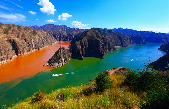 往前再走,便见黄河与洮河“泾渭分明”的奇景:受上游降水影响,洮河黄沙滔滔,撞进刘家峡水库的清波里,一清一黄界限分明,在水面铺出两道色带,格外壮阔。过了洮河口,147米高的刘家峡大坝骤然立在眼前,将向西流淌的黄河拦腰截断,坝上龙门吊矗立,蔚为壮观。