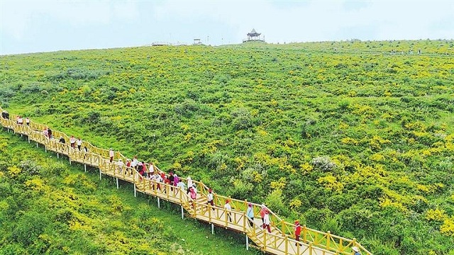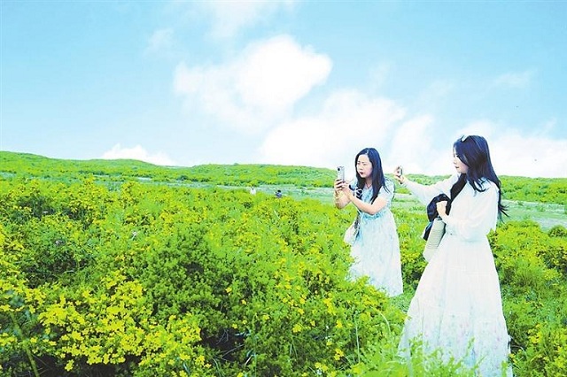 一条条栈道或向上延伸,或蜿蜒潜入花海深处,云絮缠绕在山腰,给这片绚烂添了几分缥缈。金露梅在风里轻轻摇曳,山脚下车辆如流,栈道上游人如织,从上午10时起,黄草坪便热闹得像被蜂群围住的花园,敞开最鲜活的怀抱,迎接每一个奔赴而来的身影。有人举着相机打卡拍照,想把金露梅的万种姿态定格;有人铺开野餐垫露营,任阳光洒在肩头;还有人忍不住翩翩起舞,或对着花海高歌一曲,嘴里的赞叹就像没断线的珠子,怎么也说不完。拍不够金露梅在风里的娇羞,也拍不够黄草坪在阳光与云朵交替中,那份瞬息万变的万千风情。